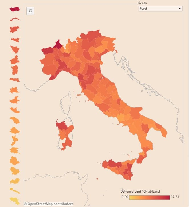 具体到省,皮埃蒙特大区东北部的韦尔巴诺-库西奥-奥索拉省(Verbano Cusio Ossola)是盗窃犯罪率最高的省,每1万名居民中有37.34人因盗窃被捕和起诉,几乎是全意平均水平(19.2人)的两倍。犯罪率最低的是卡塞塔省(Caserta),这一数字只有9.1。