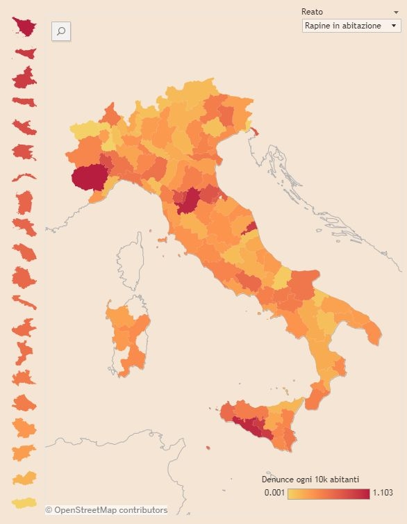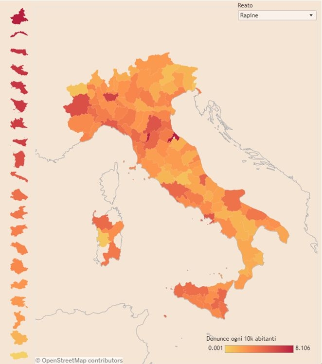 艾米利亚-罗马涅大区的里米尼省(Rimini)是抢劫率最高的省每1万名居民中有8.106人因抢劫而被捕和起诉。一直形成鲜明对比的是榜尾的撒丁岛奥里斯塔诺省(Oristano),这一数字仅为0.495,仅为里米尼的16分之一。