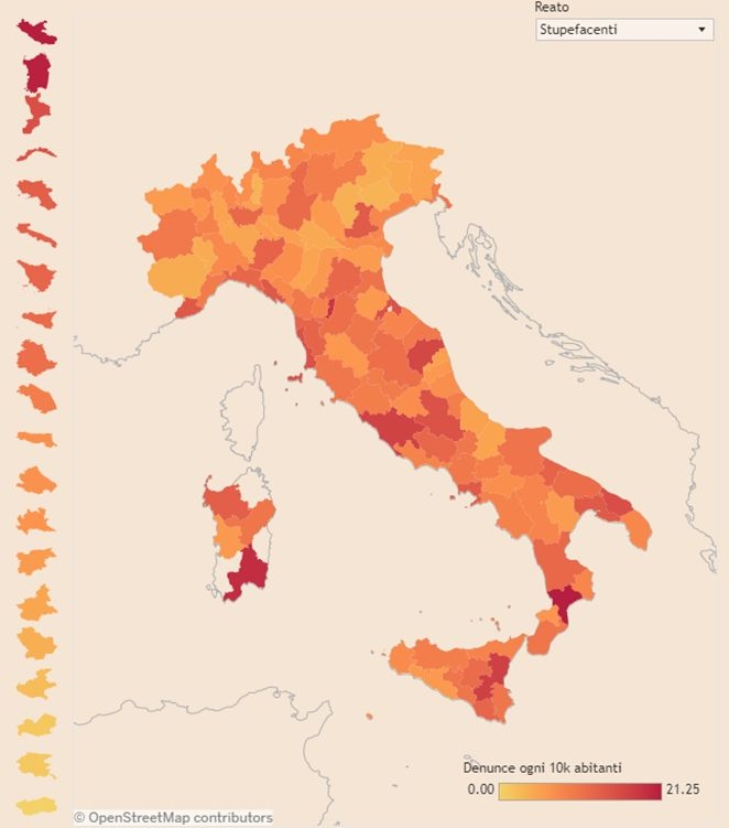 毒品犯罪率最高的大区是意大利首都罗马所处的拉齐奥大区(Lazio),每1万名居民中有15.06人因毒品犯罪被捕和起诉。第二、三位分别是撒丁岛(14.88人)和卡拉布里亚大区(12.50人)。