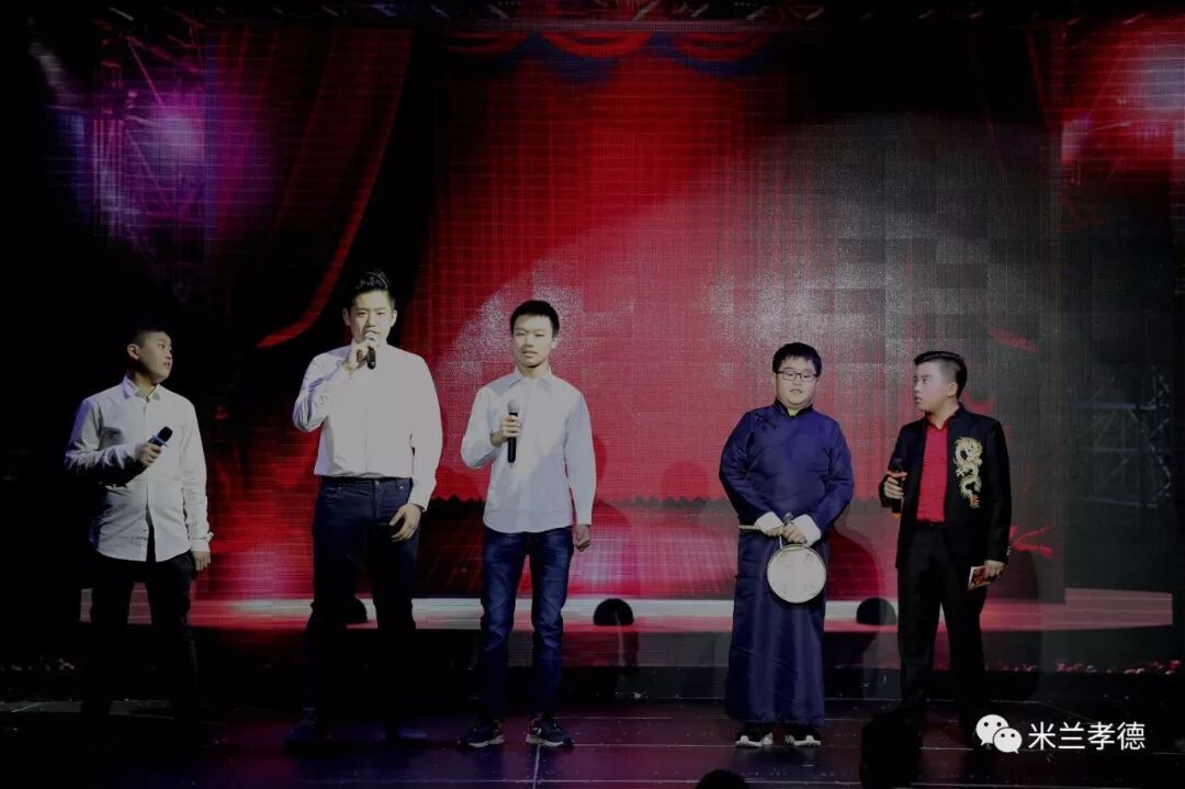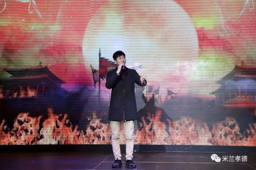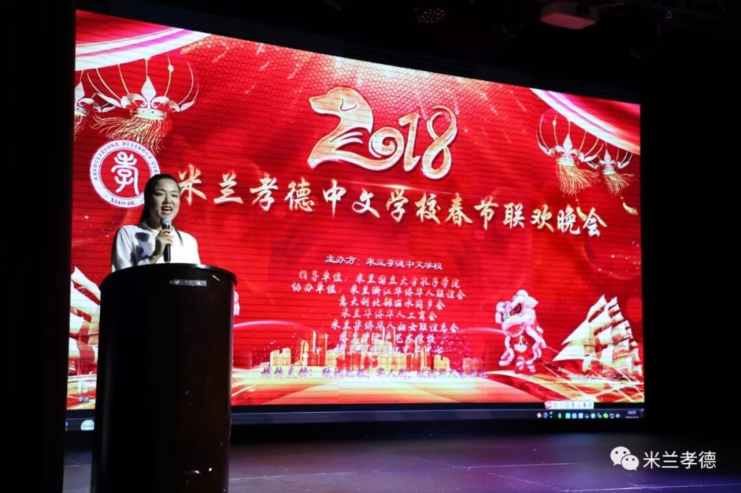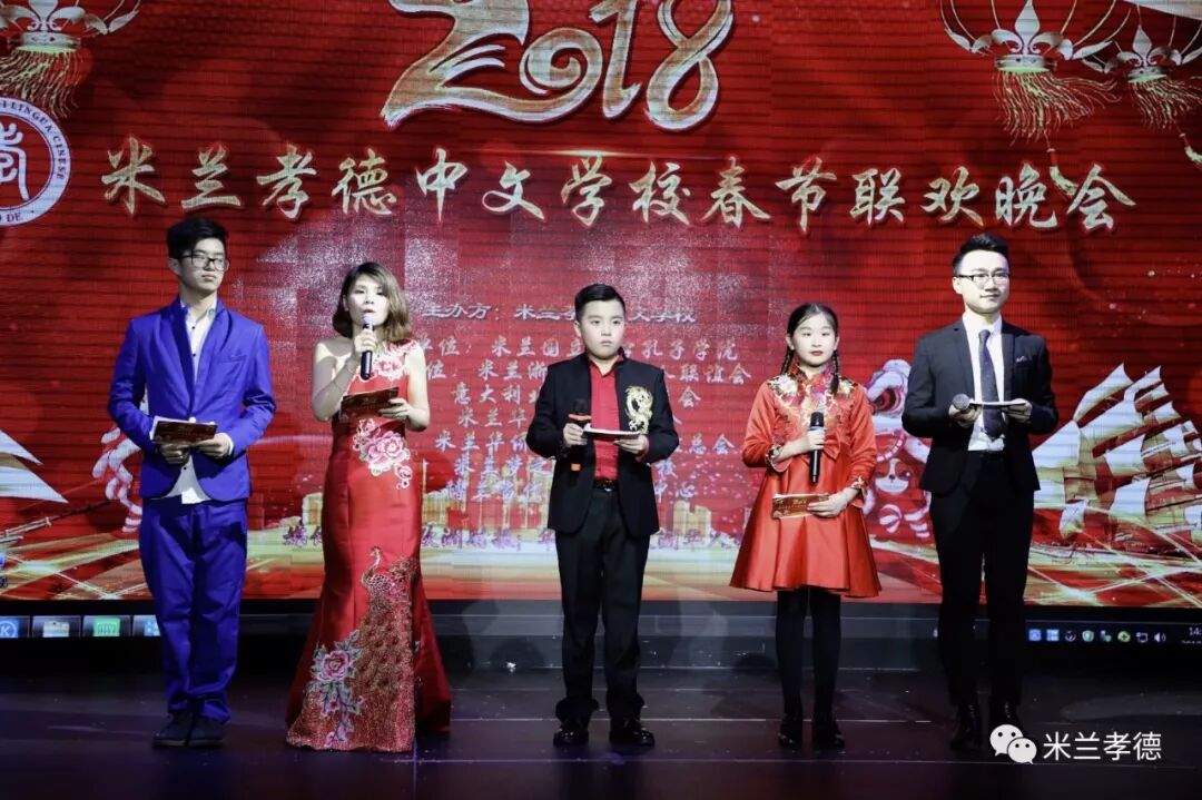 2018年2月3日晚,我校举办了米兰孝德中文学校2018年春节联欢晚会。我校教师吴尚泽、米兰国立大学孔子学院老师刘洋以及我校主持人比赛冠亚军赵曼倪和高文俊、意大利语主持胡亮担任了此次活动的主持。