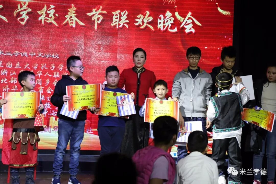 此外,为了表彰孩子们在本学年的优异表现,我校在晚会中举行了颁奖环节,米兰华人华侨工商会监事长池小云、我校教育总顾问周建煌、名誉校长周蓉芬以及梦之声培训中心负责人许雪为孩子进行了颁奖。