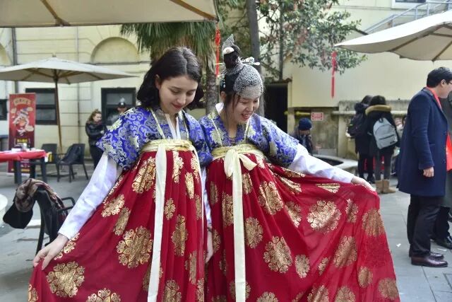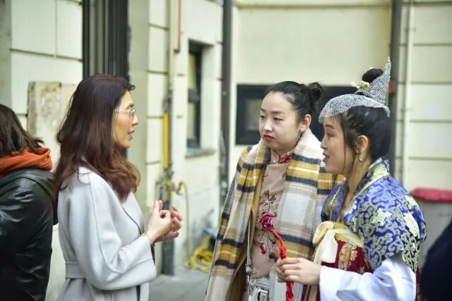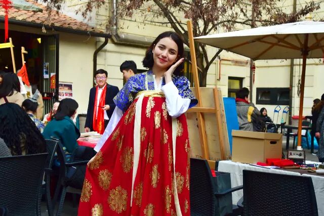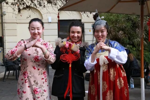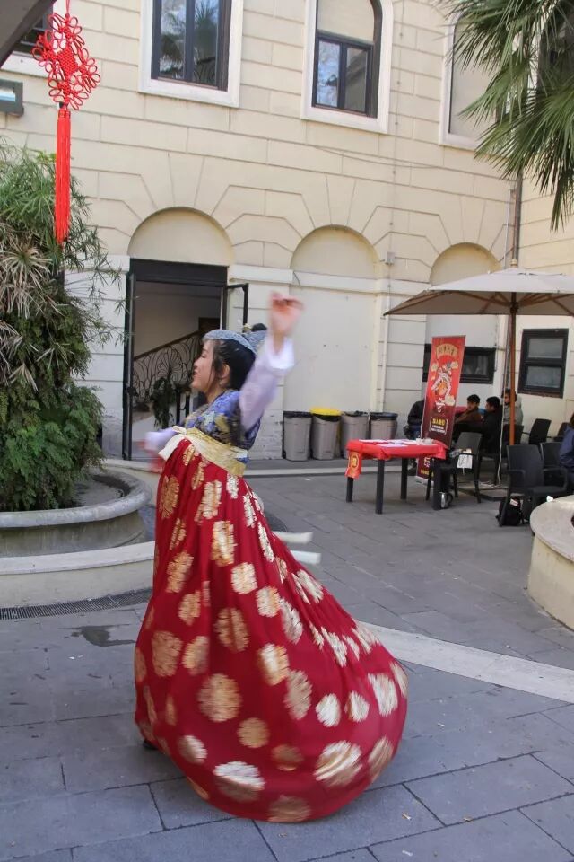 好戏还在后头呢,身穿唐装的杨柳飞同学更是得到了意大利同学们的青睐,纷纷争取和她合影。她还现场来了一段迎宾舞蹈,跟大家一同庆祝这欢乐的时刻。洪羚乙同学很巧地也带来一套一模一样的唐装,给意大利朋友们穿上体验感受~画面简直太美~我就直接放图了...