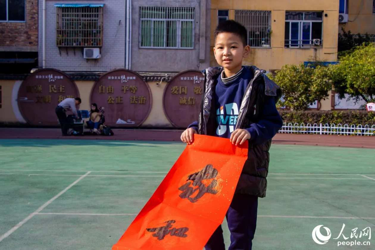 小朋友向镜头展示春联。人民网 林铭贤摄