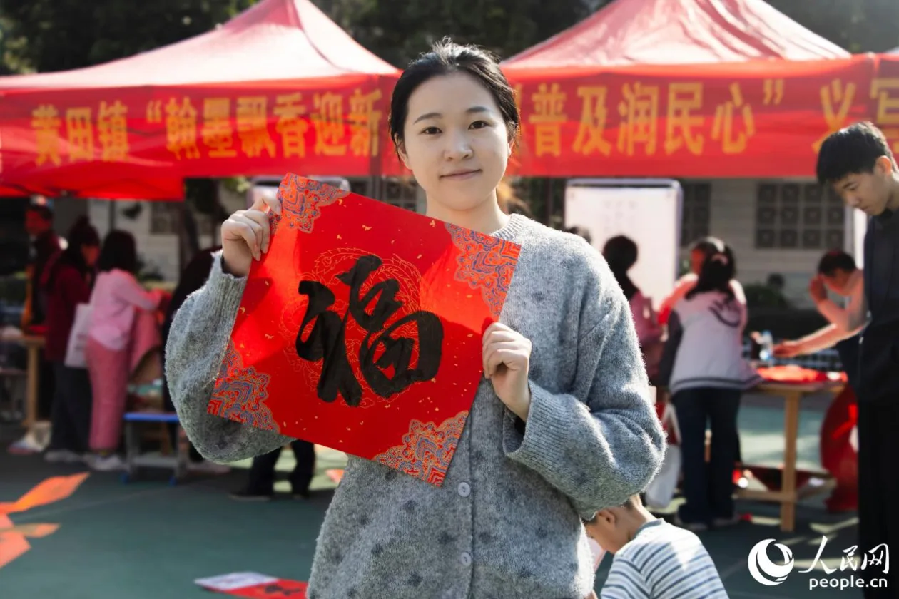 人民网宁德2月6日电 (林盈、林铭贤)“你去把我们家的‘福’看好了,别被风吹走了。”6日上午,在福建省宁德市古田县黄田镇中心小学的操场上,义写春联的活动热热闹闹地办开了,附近居民携老带幼地来“接春”。