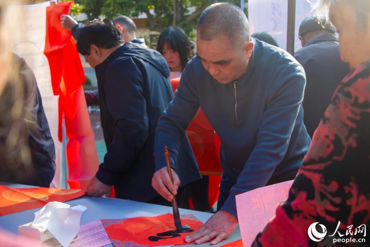 书法家正在为当地居民题写春联。人民网 林铭贤摄