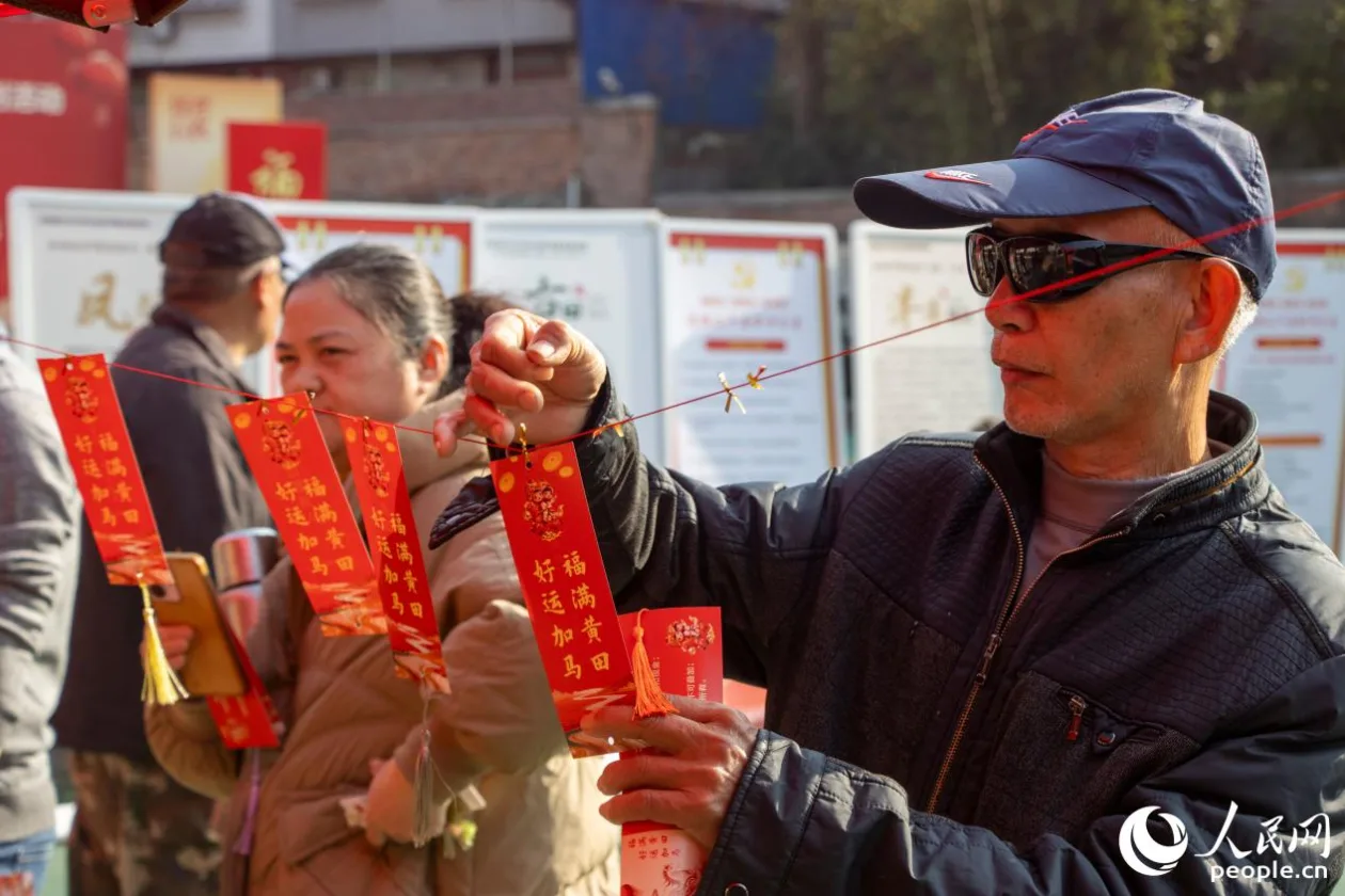当地居民展示刚领到的春联。人民网 林铭贤摄