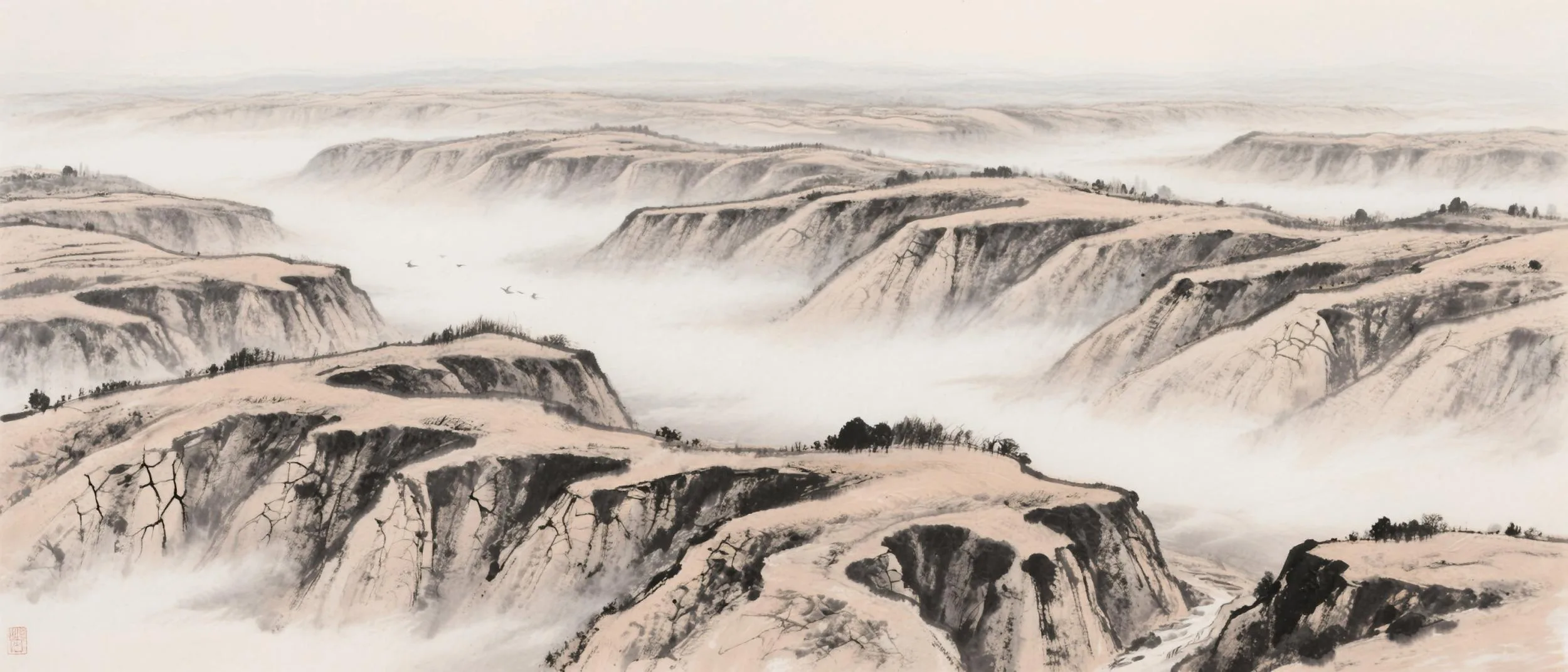 《黄土坡》实现了“泥土为纸”的视觉效果:画面模拟了泥土的颗粒肌理与不规则边缘,让墨迹仿佛从大地中生长出来,赋予作品浑厚而鲜活的生命力。在这一框架下,郑旭的创作生动展现了超级个体在传统文化领域的潜力,也为“一人公司”的落地提供了实践样本。