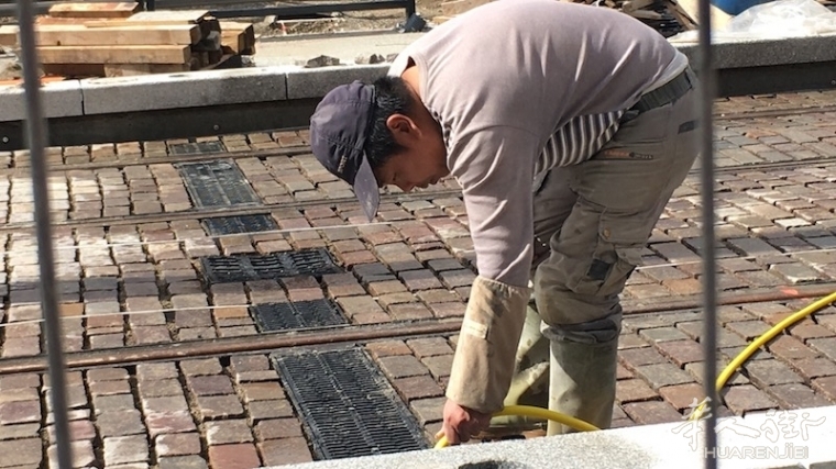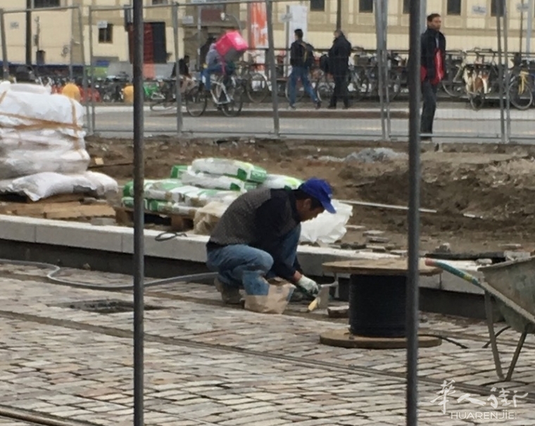 一队有4名中国人组成的翻修队来到工地上,井然有序的拿出工具在工地道路上开工,一些老外看中国工人来到工地上做工表示疑惑。