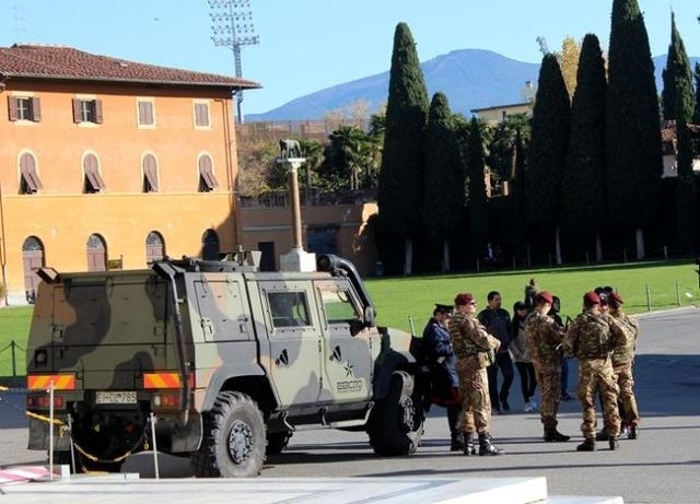 在意大利的比萨城比萨斜塔周围,军方在持枪执勤
