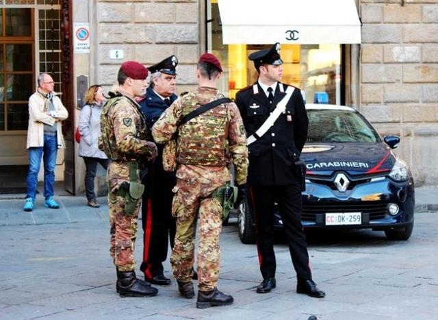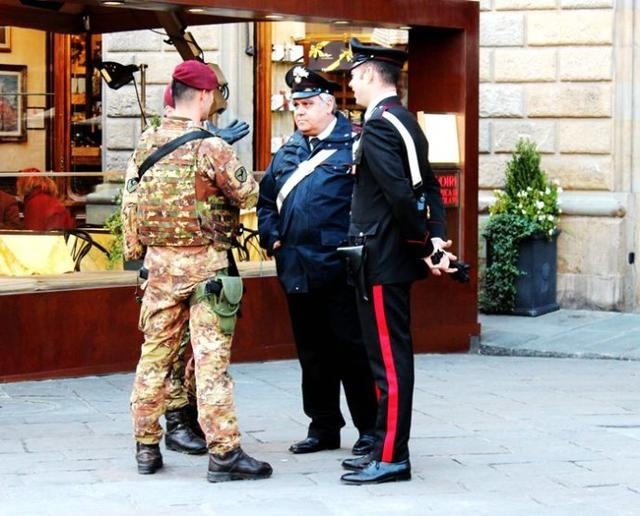 在佛罗伦萨市的美帝奇古堡外面,比萨城的比萨斜塔周围,都是意大利的现役军人持枪守卫,或者说,携带枪支弹药站岗放哨,这是意大利的反恐、防恐现状。在意大利,防恐,军方绝对是主力军。可见意大利对反恐、防恐的高度警觉性和严密的戒备状态。基本属于随时应付突发事件,做好“战斗”准备。