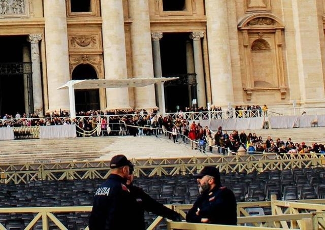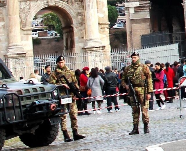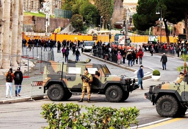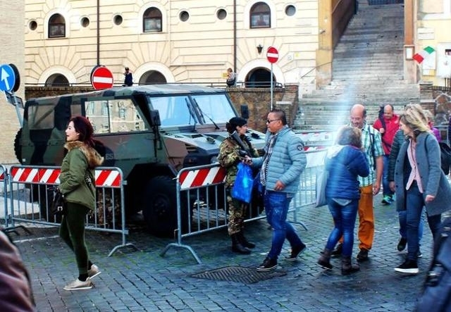 特别是旅游景区,在1000多年前的罗马斗兽场,周围警戒森严。入口处有意大利军人执勤站岗;在斗兽场的周围、马路上,随处可见军人手执武器,布好警戒线,停放着警戒车辆,严阵以待,随时准备处置突发情况。梵蒂冈虽然是一个宗教国家,有国家军队,但手中没有杀伤性武器。他们雇佣了意大利警察和军事人员,协助严防死守圣彼得大教堂和玛丽安广场。