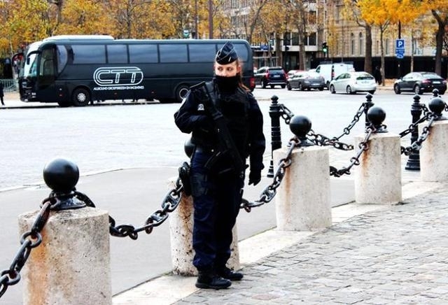 法国女警察在凯旋门下持枪执勤