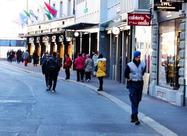 瑞士的琉森市街上的巡逻警察 一副心不在焉的状态