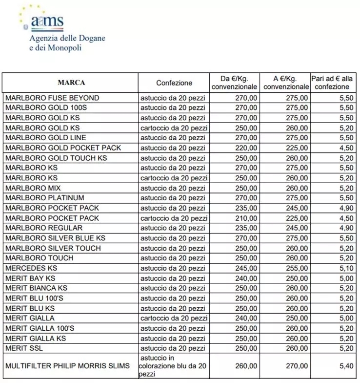 (部分涨价的香烟品牌。图片来源:意大利海关和垄断局官网)