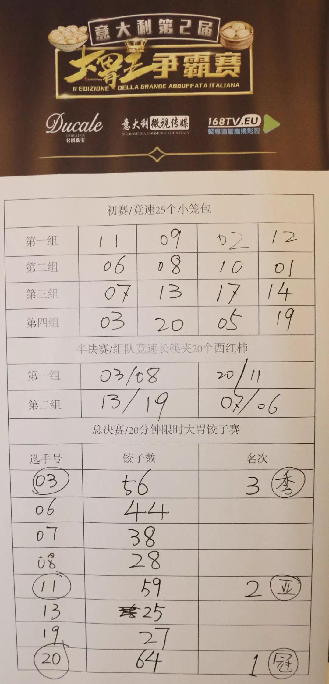 夺魁冠军,拿到了意大利第二届大胃王的美誉