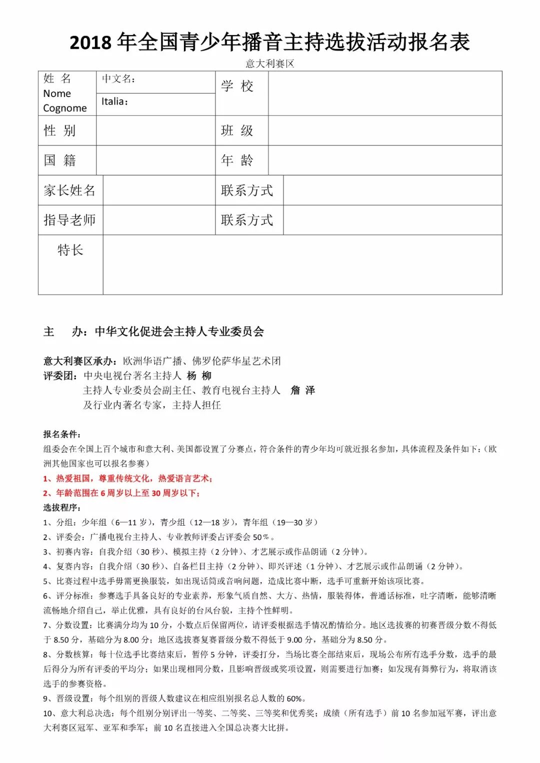 2018青少年播音主持选拔活动诚邀意大利赛区品牌战略合作单位,共同参与赛事,一同为推广普通话、提升汉语言文化素养传承中国优秀传统文化尽绵薄之力。总冠名