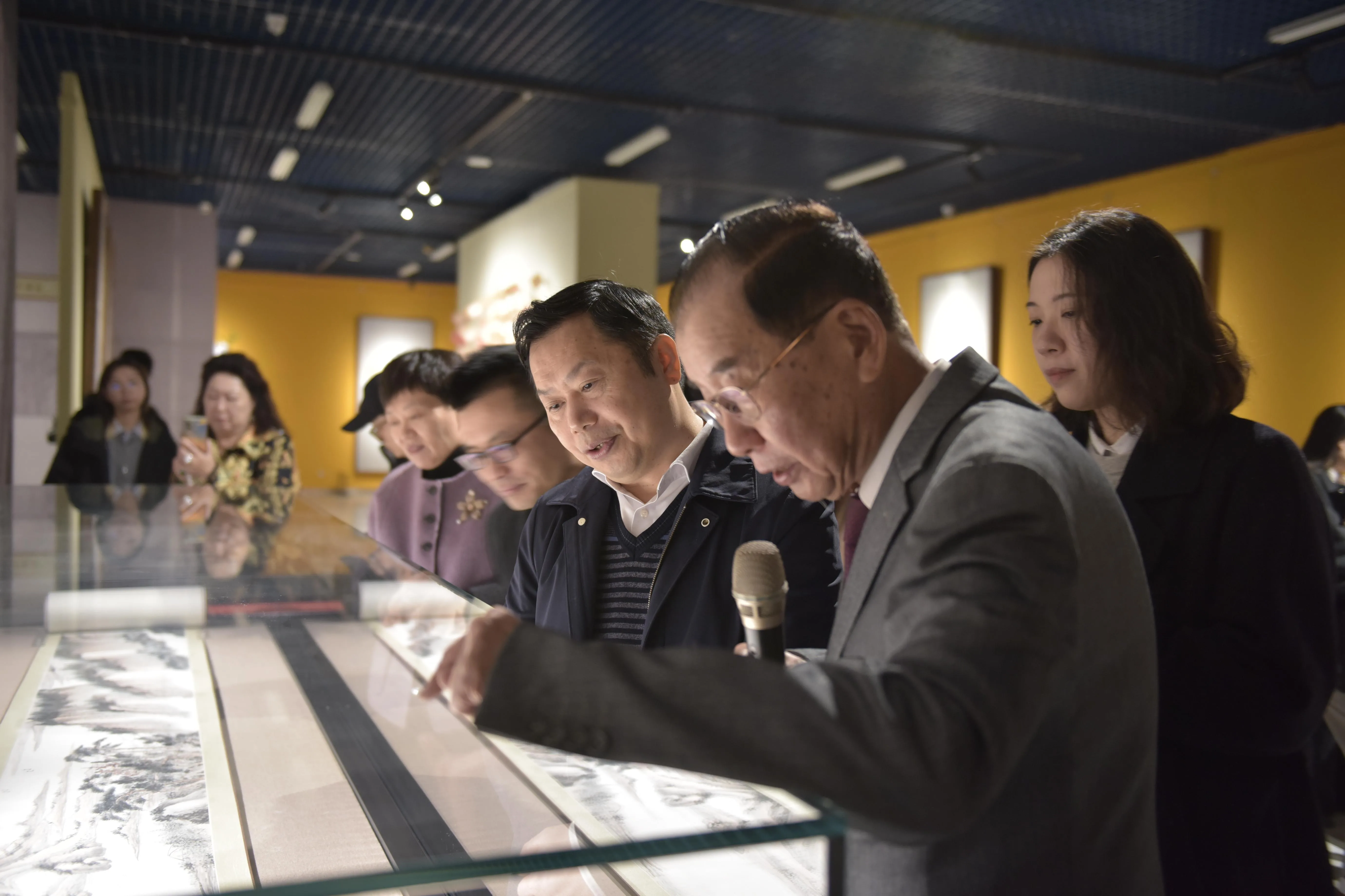 现场嘉宾一同步入展厅,一幅幅笔墨精湛的书画作品整齐陈列,既有雄浑大气的山水长卷,也有雅致清丽的“四君子”小品,还有兼具风骨的碑学书法,每一件作品都承载着朱龙盦、吴韵如伉俪的艺术追求与家国情怀,吸引着观众驻足凝视、轻声品鉴。有的认真阅读作品背后的故事,有的与同行者交流心得体会,有的拿出手机记录作品细节,沉浸式感受传统文人艺术的独特魅力。