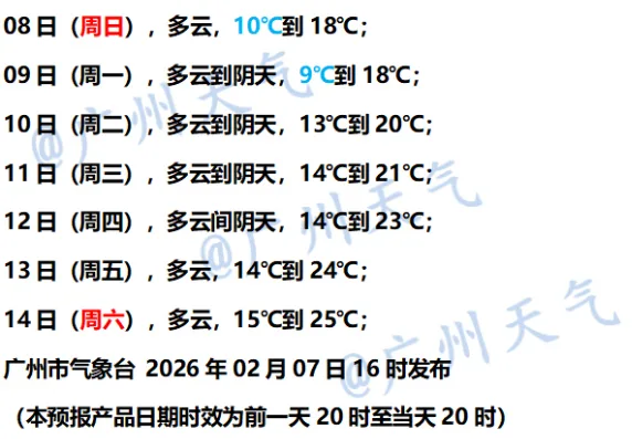 2月9日,粤北市县多云转小雨,其余市县多云,局部有小雨。粤北市县4~8℃(高海拔山区1~3℃),粤西市县14~18℃,其余市县9~12℃。