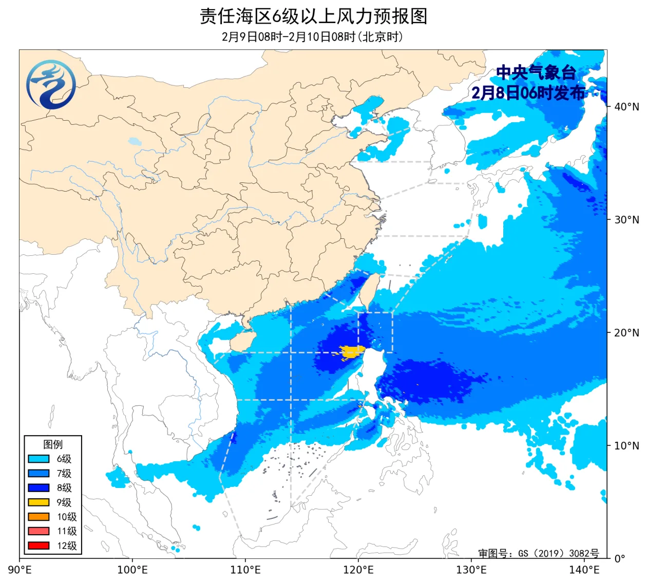 8日08时至9日08时,黄海中部和南部、东海、台湾海峡、台湾以东洋面、巴士海峡、北部湾、南海大部海域将有7~8级的大风,其中台湾海峡、巴士海峡、南海东部局部海域的风力可达9级、阵风10级。