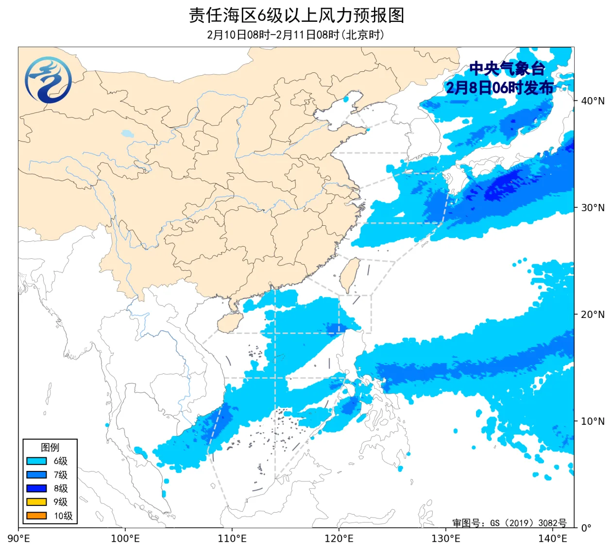 2月7日14时至8日02时,渤海海峡、南海西南部海域出现了5~6级、阵风7级的偏北风,黄海大部海域、东海大部海域、台湾海峡、台湾以东洋面出现了6~8级、阵风9级的偏北风或西北风,巴士海峡、南海东北部海域出现了6~8级、阵风9级的东北风,南海西部海域出现了5~6级、阵风7级的东北风或偏东风。