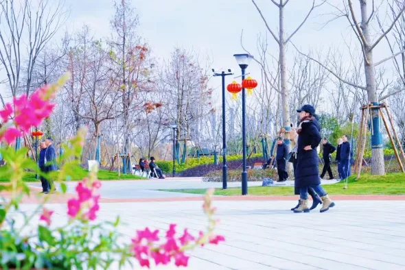 尽管时值冬日,公园却是满目青绿、水流潺潺,一派生机勃勃的热闹景象。市民们携家带口、结伴而来,沿着蜿蜒步道漫步,在亲水平台驻足,于开阔草坪休憩,孩子们在游乐区畅快玩耍,老人们坐在长椅上闲话家常,青年们则用镜头记录下眼前如画的风光。公园的设计没有刻意造景,而是巧妙顺应原有的地形和水系而建,开阔平地与蜿蜒小径相互串联,水面波光潋滟、树木郁郁葱葱,构成一幅高低错落、自然相融的园林长卷,漫步其间,移步换景,尽是悠然惬意与鲜活人气。