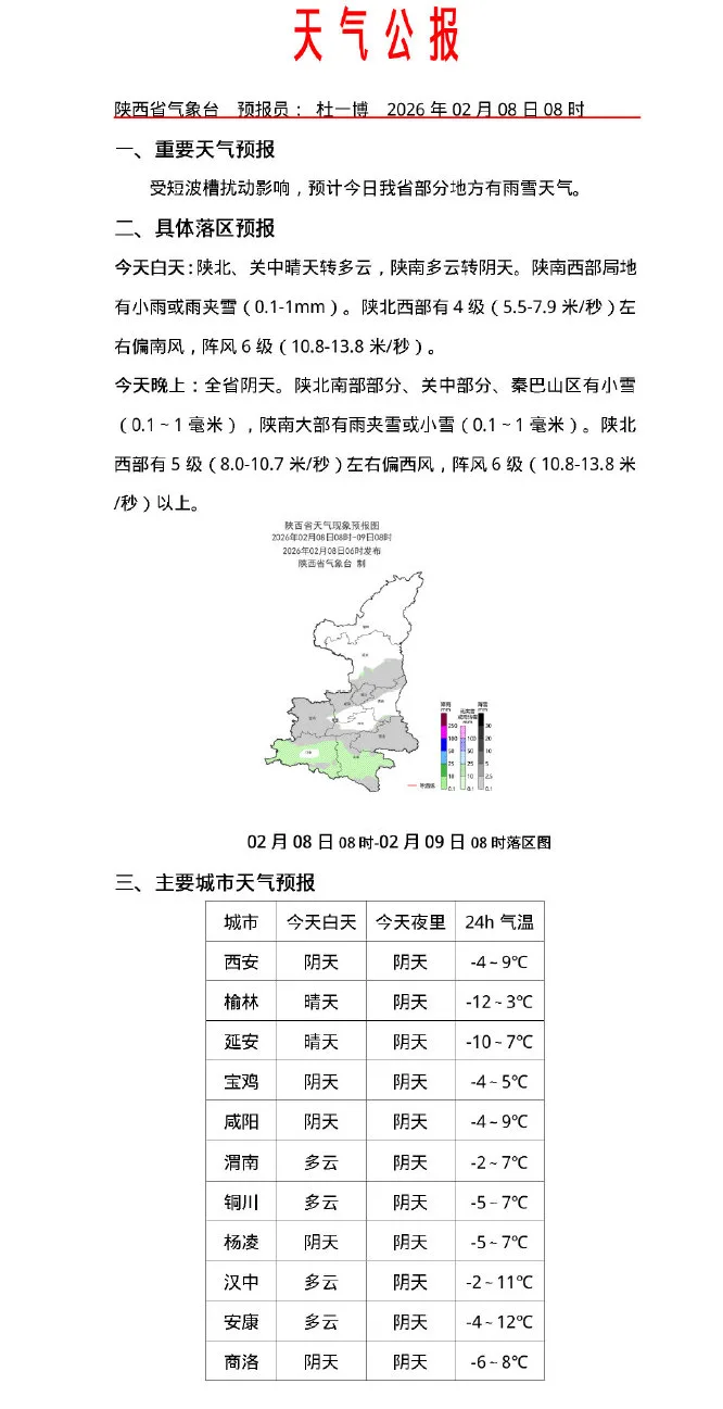 今天晚上:全省阴天。陕北南部部分、关中部分、秦巴山区有小雪(0.1~1毫米),陕南大部有雨夹雪或小雪(0.1~1毫米)。陕北西部有5级(8.0-10.7米/秒)左右偏西风,阵风6级(10.8-13.8米/秒)以上。