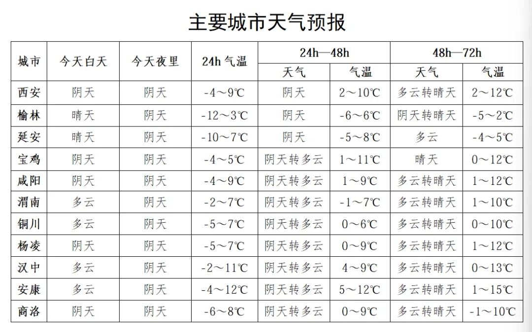 16日: 全省阴天,陕北、关中北部有雨夹雪或小雪,关中南部、陕南有小雨,秦巴山区有小雪或雨夹雪。