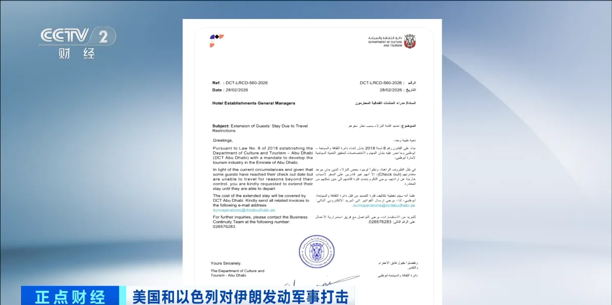 报道称,阿联酋阿布扎比文化和旅游局向当地酒店发出通知,要求为受地区局势影响而无法离境的旅客延长住宿服务,并表示相关费用由政府承担,并要求酒店直接向政府提交相关账单。阿布扎比政府方面还表示,当地酒店应将客人住宿延长至其能够离境为止。
