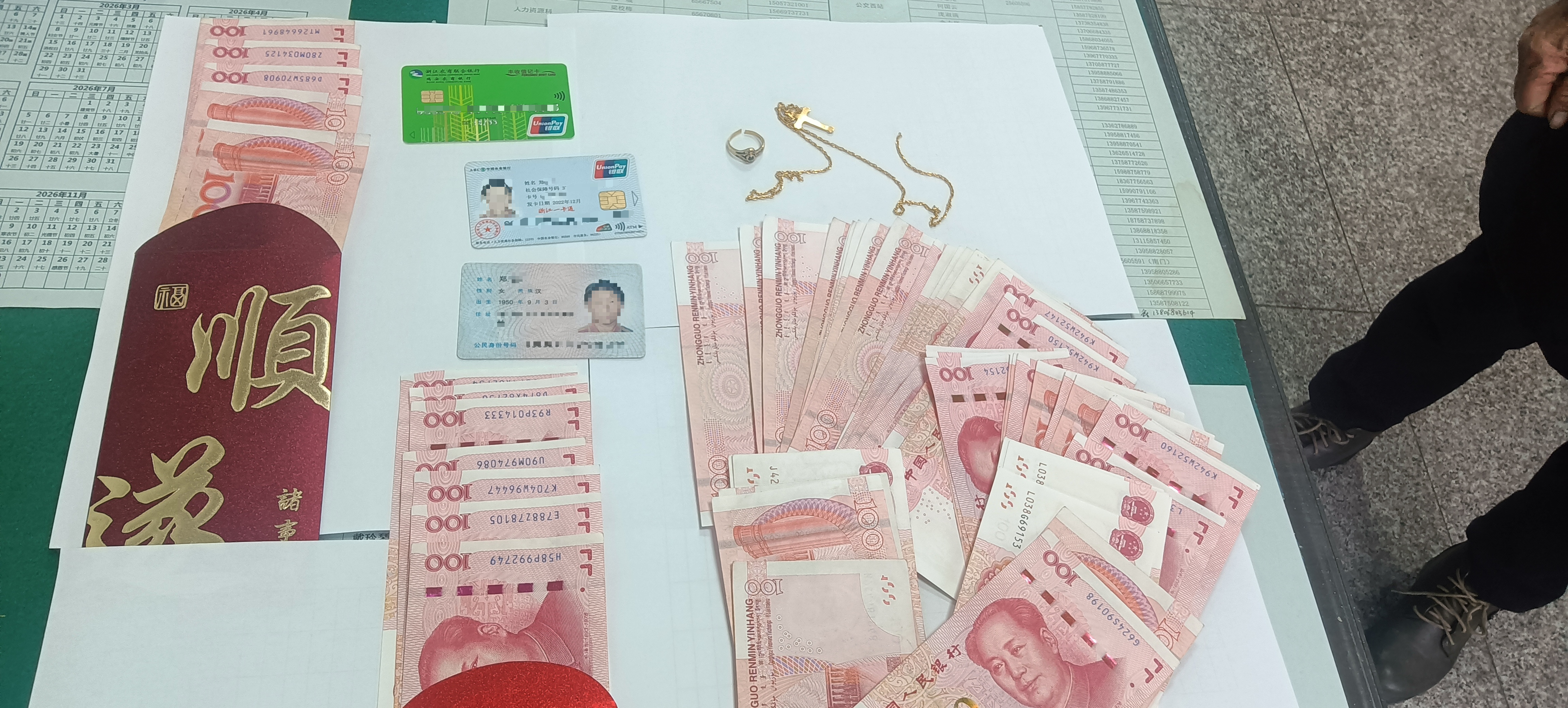 2月28日13时30分,瑞安7A路驾驶员周建军完成营运任务抵达终点站章底,对车厢进行例行检查时,在座位上发现一个黑色双肩包。周建军第一时间将背包上交给站务工作人员,并与其对包内物品进行了清点,以便寻找失主的线索。当背包被拉开后,里面的物品让大家都替失主捏了一把汗,除了重要的身份证件和银行卡外,还有两件精致的金首饰以及厚厚一沓现金,经过清点共计6700元。