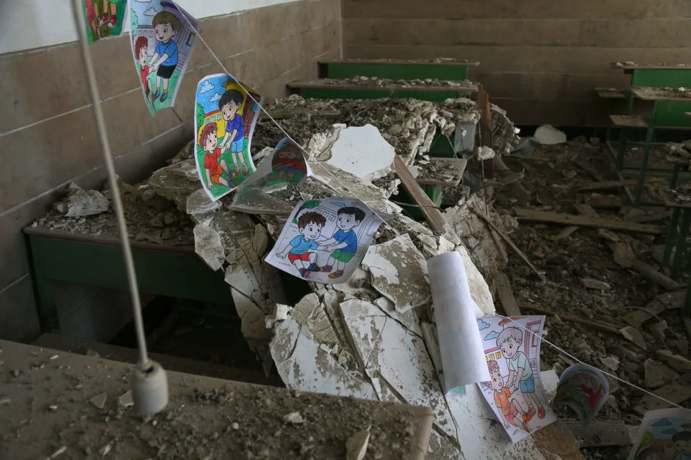 3月3日,在伊朗德黑兰市中心的沙希德·马哈拉提学校,教室内一片瓦砾。新华社记者沙达提摄