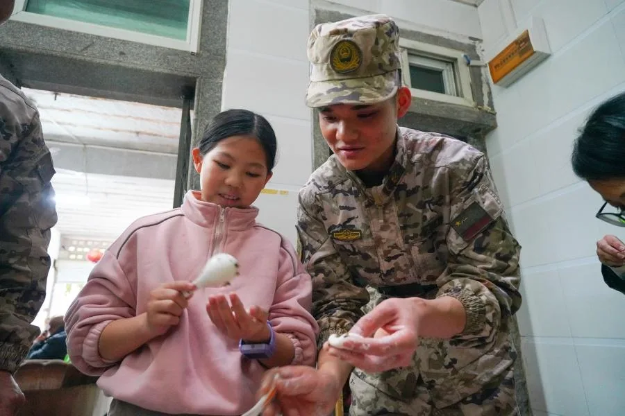 武警泉州支队某中队携手驻地学生和志愿者扎实开展学雷锋系列实践活动。50余名中学生走进营区,开启“沉浸式”军营体验,参观荣誉室、训练场和班排宿舍。荣誉室内,“学雷锋先进集体”等奖牌熠熠生辉,60余年传承的学雷锋故事深深打动着在场学生。在授牌仪式上,政治指导员为新兵和学生代表授牌,“传承雷锋精神,争做新时代雷锋精神的传承者、实践者!”的铿锵誓言响彻营区。多年来,该中队持续深化军民共建,培育了32名“学生讲解员”,先后涌现116名“学雷锋标兵”。随后,官兵们和志愿者走访慰问困难群众,主动帮忙打扫庭院、整理卫生,送上慰问金和生活用品,大家围坐一起搓汤圆、话家常,一碗碗软糯香甜的汤圆盛满了军民深情。