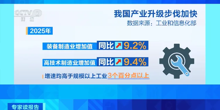 从国家层面的“大账”来看,随着我国产业升级步伐加快,从2020年到2024年,我国装备制造业和高技术制造业增加值分别年均增长7.9%和8.7%;2025年,这两项的增幅更是进一步提升至9.2%和9.4%,增速均高于规模以上工业3个百分点以上。