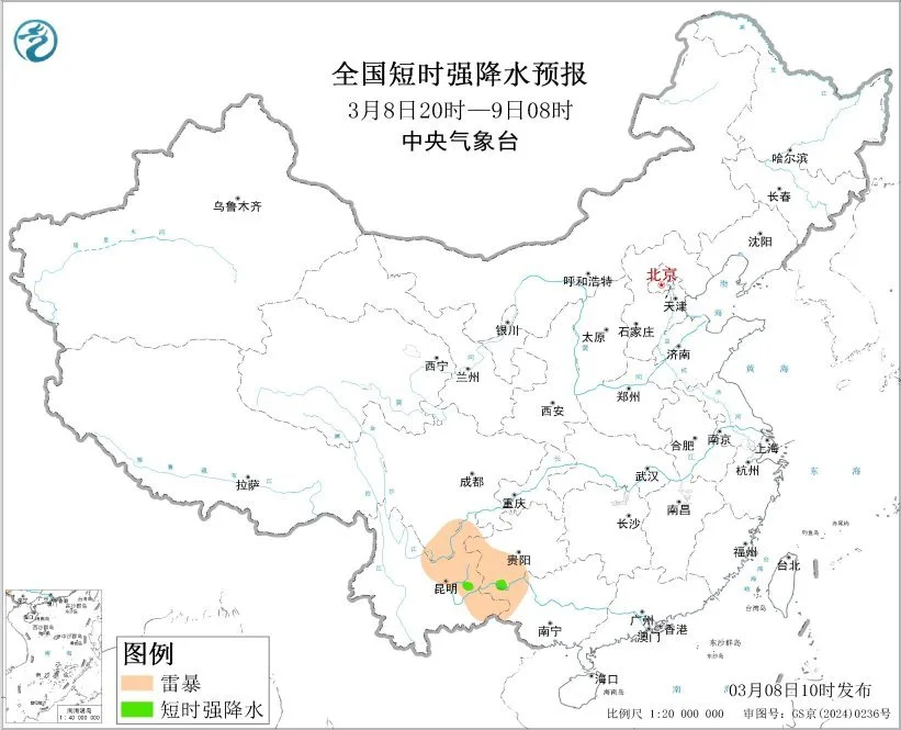 预计3月8日14时至9日08时,四川南部、贵州西部和南部、云南东部、广西北部等地的部分地区将有雷暴天气;贵州西南部、云南东部、广西西北部等地的局地将有短时强降水天气,小时雨量20-30毫米。