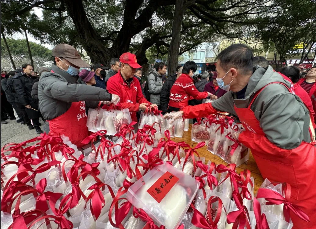 他们特地从永嘉定制260多个寿桃及同红日亭义工们现场煮长寿面,免费分发给市民,现场其乐融融。市民捧着热腾腾的长寿面和寿桃,为老人及家人过生日新风尚点赞。