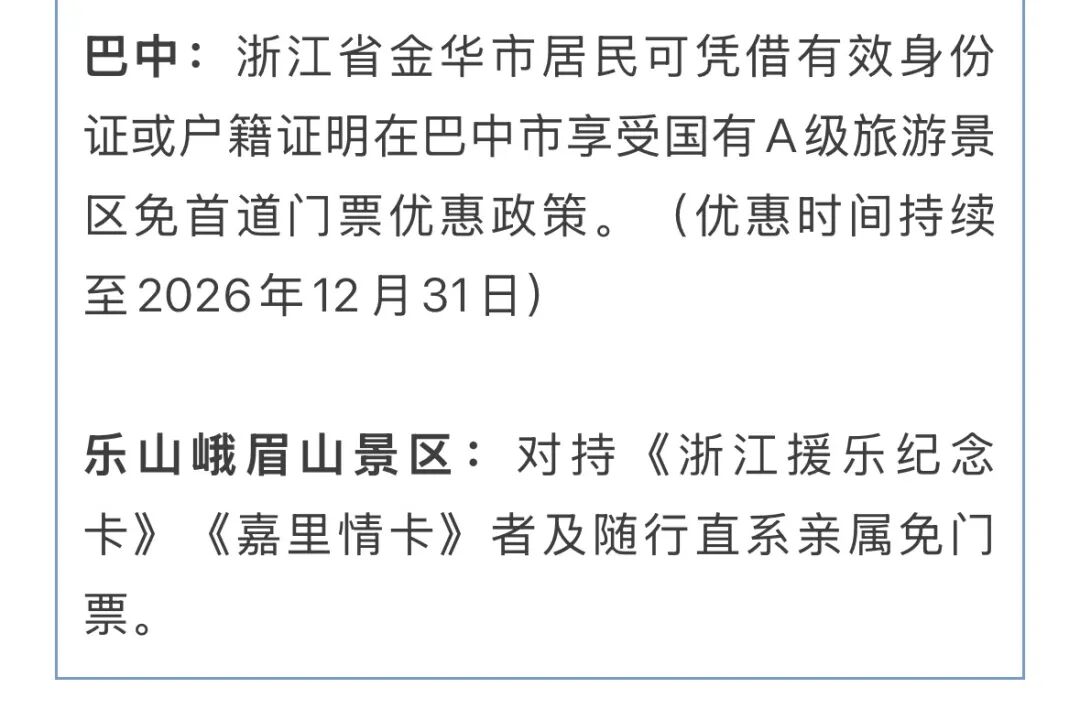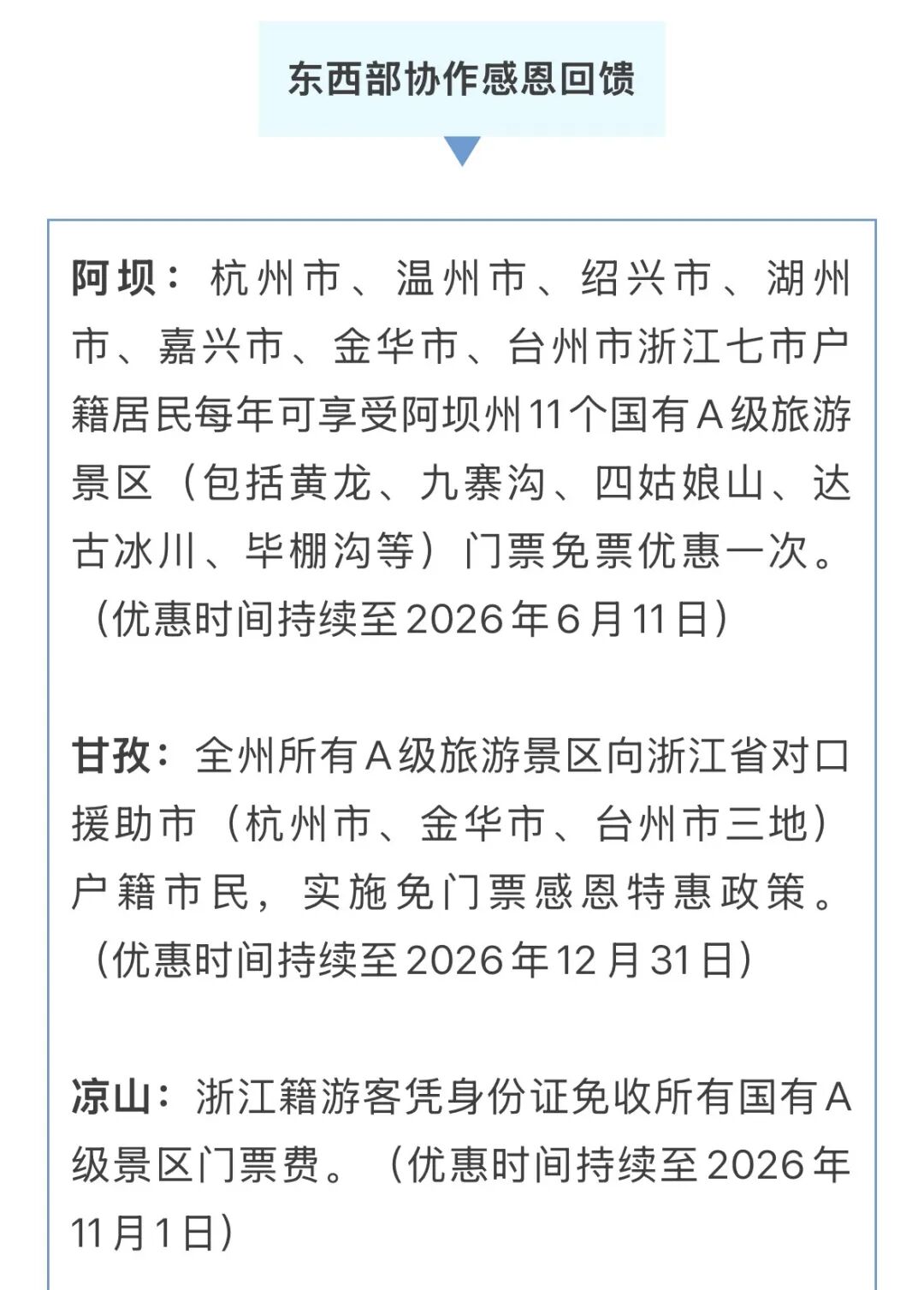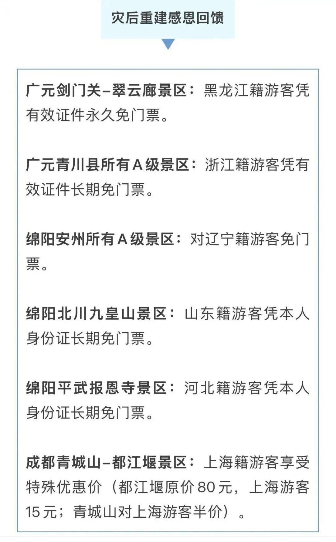 当年汶川特大地震后,举国驰援四川。川人知恩于心、感恩于行,不少景区都对对口援建省市游客推出免票或优惠票价政策。同时,为感谢近年来浙川东西部协作,不少景区也推出了针对浙江籍游客的免票或优惠票价服务,作为对帮扶情谊的真诚回馈。