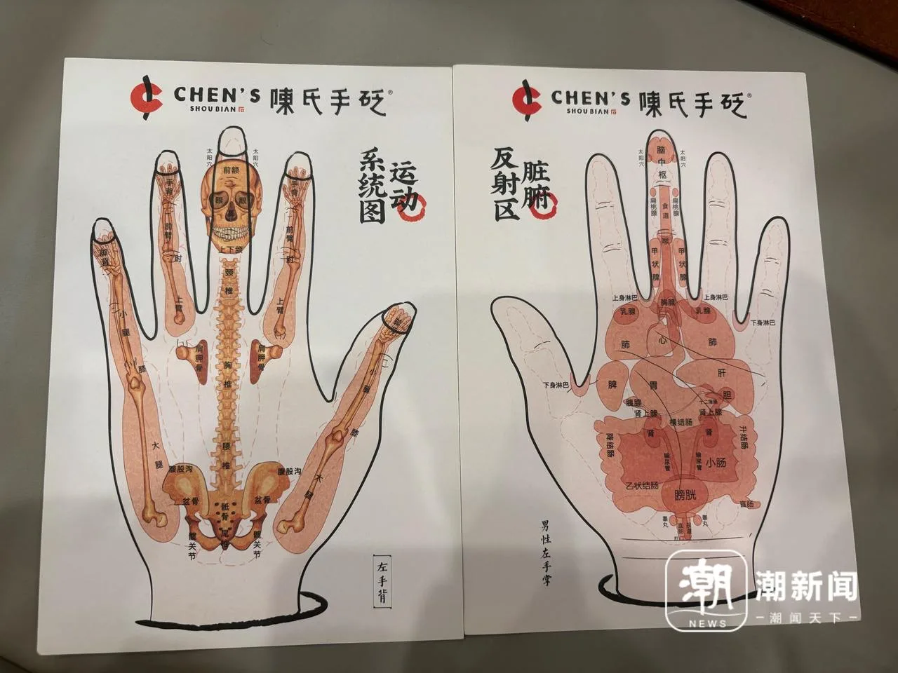 他拿出两张手部图,分别是一只手的正反面。陈西隆介绍,手砭疗法的核心理论深植于中医阴阳学说。人的手背属阳,对应头颈、脊柱、四肢等外在形体;手掌属阴,对应心、肝、脾、肺、肾等内在脏腑。人体仿佛被完整“映射”在双手之上,形成了一套清晰的手部反射体系。