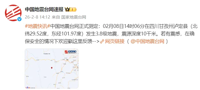 您的位置 > 首页 > 国内 四川甘孜州泸定县发生3.8级地震,震源深度10千米 来源: 中国地震台网 | 2026-02-08 | 👁:7 中国地震台网正式测定:02月08日14时06分在四川甘孜州泸定县(北纬29.52度,东经101.97度)发生3.8级地震,震源深度10千米。 标签: 暂无标签 上一篇 “一日往返 舒适出行” 高铁拉近了我们与家的距离 ❤️ 赞一个 (0) 🔗 分享 用户评论 (0) 暂无评论,快来抢沙发吧!首评可提升互动曝光。 请 登录 后参与互动