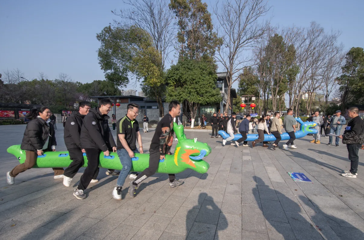 同心协力、旱地龙舟项目更是将团队协作的考验推向极致。裁判发令后,赛场上立刻响起整齐划一的口号声,各支队伍铆足全力、奋勇向前。有的队伍配合天衣无缝,步伐铿锵、行进如风,一路领先;有的队伍起初略显踉跄、节奏稍乱,但队员们相互鼓劲、及时调整,拼尽全力冲向终点。