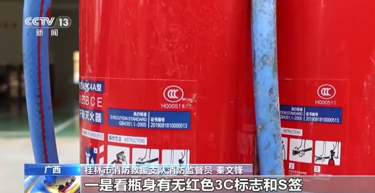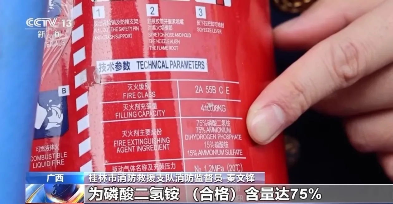 桂林市消防救援支队消防监督员 秦文锋:按照国家标准,ABC干粉灭火剂的主要组分为磷酸二氢铵,含量应达到75%。然而不合格的灭火器中,磷酸二氢铵含量只有50%甚至20%,取而代之的是掺入一些廉价的滑石粉等填充物,这样的灭火器,喷出来的粉末不仅灭不了火,甚至助长火势。