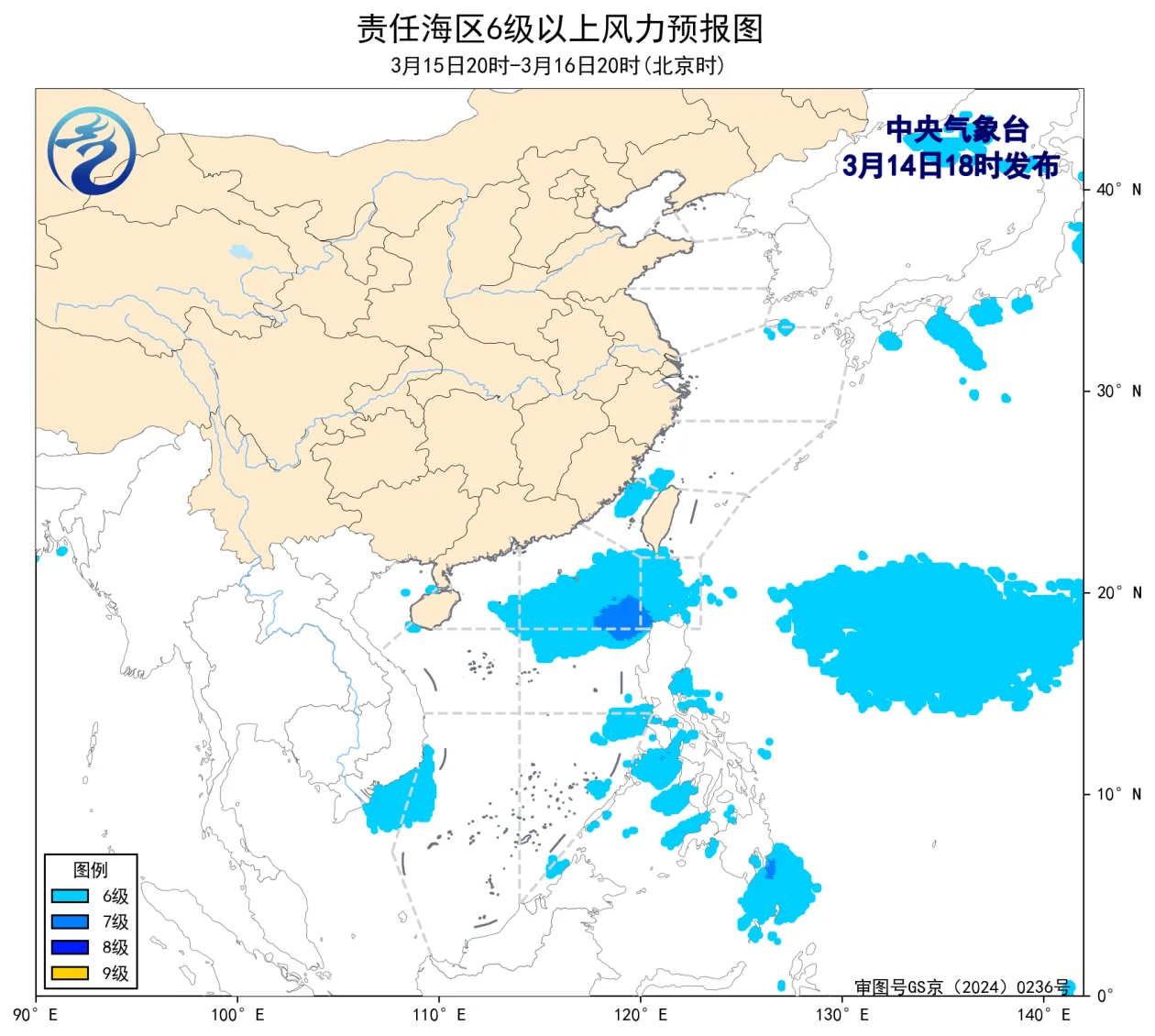 预计,3月17日夜间至21日白天,渤海将有6~7级、阵风8~9级的大风,渤海海峡、东海大部海域、巴士海峡将有5~7级、阵风8级的风,黄海大部海域、台湾海峡、台湾以东洋面、北部湾、南海东北部海域、南海中西部海域、南海东南部海域将有5~6级、阵风7级的风。