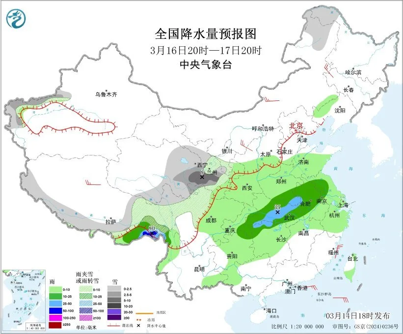 3月16日20时至17日20时,内蒙古东北部、黑龙江北部、甘肃南部、青海东部、新疆西部、西藏西部和东北部、川西高原大部等地部分地区有小到中雪或雨夹雪,局地有大雪。湖北大部、安徽中部、河南南部、江苏西部、重庆东部、贵州北部、西藏东南部等地部分地区有中到大雨。内蒙古中北部、西藏南部等地部分地区有4~6级风;巴士海峡、南海东北部海域有5~6级大风、阵风7级(见图3)。