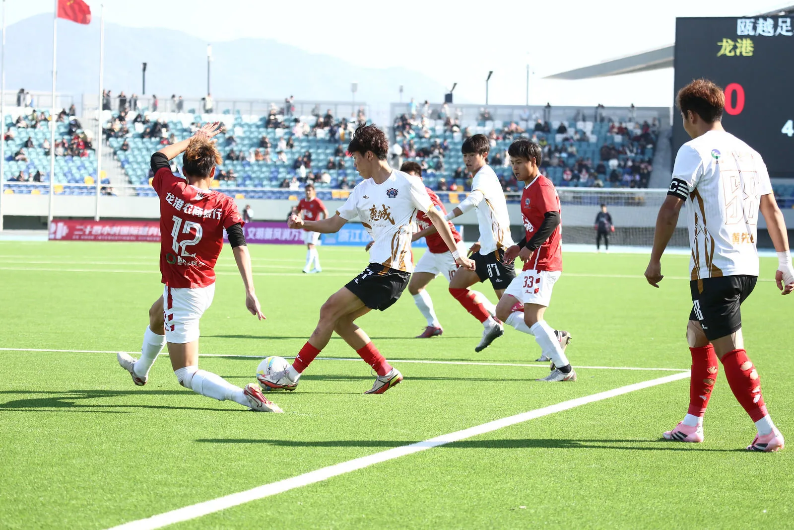 龙港队在龙港体育中心体育场主场对阵鹿城队,比赛踢得一波三折。当天球场看台上吸引了8000余名观众现场观赛,在主场球迷的助威下,龙港队占据主动。第26分钟,龙港队进攻三连击洞穿了鹿城队球门,33号陈永杰左路下底传中,中路的27号林赏赐第一脚打门被后卫挡回,18号林宗孟第二脚远射,鹿城队门将扑球后,皮球击中横梁弹回,30号陈宇第三脚射门终于得手。不过,主裁判在观看了视频回放后,确认陈永杰在传球前,故意手球犯规,因此龙港队进球无效,双方重回同一起跑线,鹿城队逃过一劫。上半场,占尽主场优势的龙港队与鹿城队战成0比0。