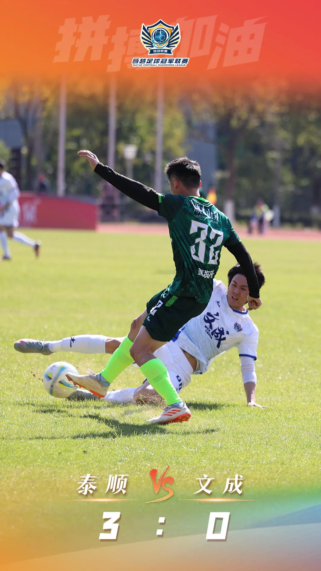 第83分钟,泰顺队28号吴昊带球突破后,大力抽射,文成队门将虽尽力扑救,但皮球依然洞穿他的十指关,2比0。补时第三分钟,泰顺队32号童贤乐主罚60米超远距离任意球,直接破门,3比0,锁定胜局,这也是泰顺队本届赛事首次收获积分。