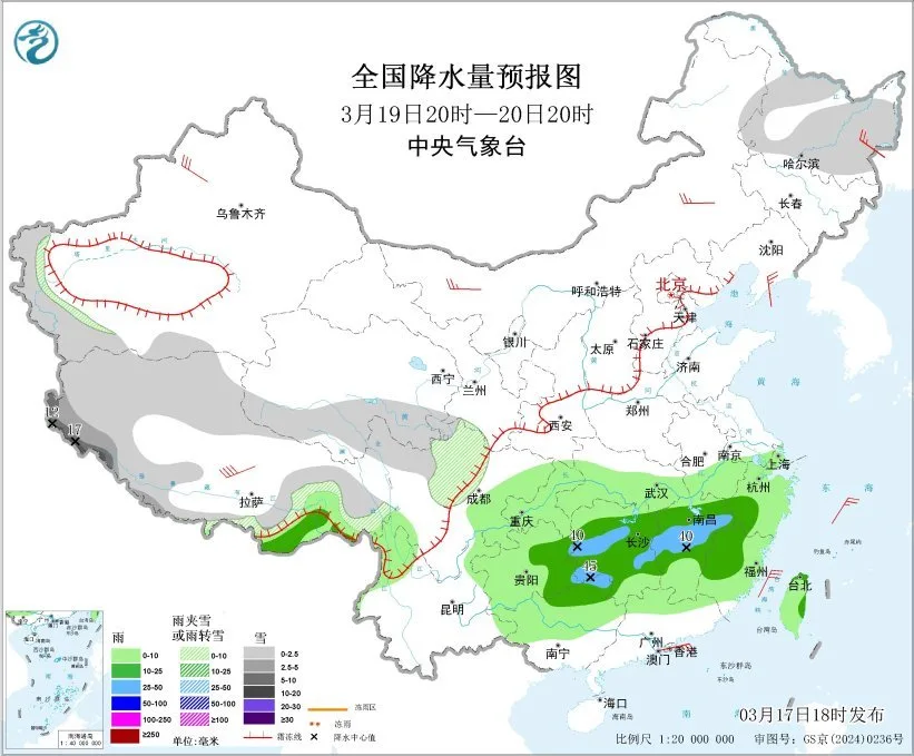 图1 全国降水量预报图(3月17日20时-18日20时)