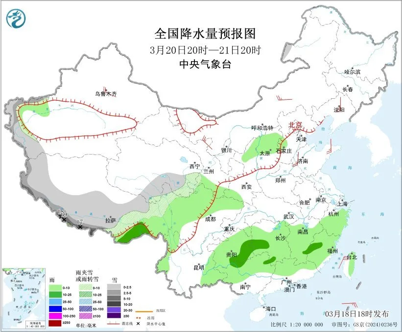 3月19日20时至20日20时,新疆南疆西部山区、青海南部、西藏西部和东北部、黑龙江东部、川西高原西北部等地部分地区有小到中雪或雨夹雪,其中,西藏西部有大到暴雪,局地大暴雪(10~23毫米);浙江西南部、福建西北部、江西中北部、湖南中北部、贵州东部、广西北部、西藏东南部等地部分地区有中到大雨。内蒙古中西部、黑龙江东部、辽宁南部、新疆北部、西藏南部等地部分地区有4~6级风;台湾海峡有5~6级风、阵风7级(见图2)。