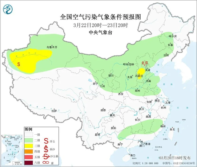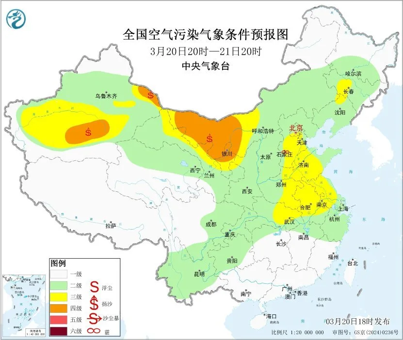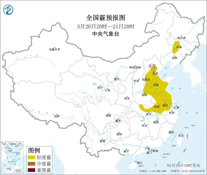 20日夜间至21日上午,山东东部、江苏北部、安徽南部、湖北中东部、湖南中北部、江西北部等地的部分地区有大雾,局地有能见度不足200米的强浓雾。此外,20日夜间至22日,新疆东部和南部、内蒙古中西部、宁夏、甘肃中西部等地的部分地区有扬沙或浮尘天气。