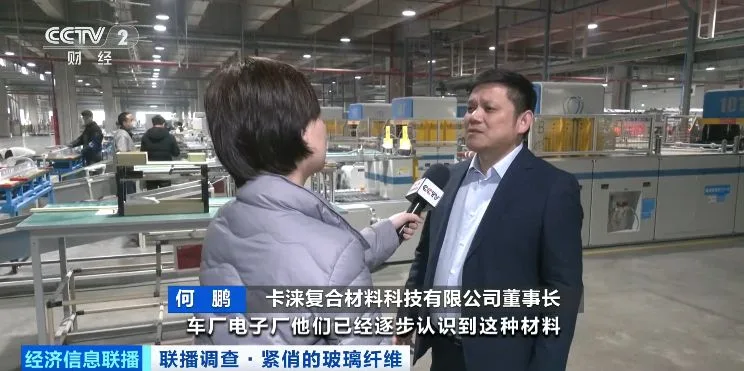 卡涞复合材料科技有限公司董事长 何鹏:车厂电子厂已经认识到这种材料,今年预期在去年的基础上用量要翻一番,用到更多。今年,玻璃纤维用量我们统计在1万多吨,预期明年应该在2万吨到3万吨左右。