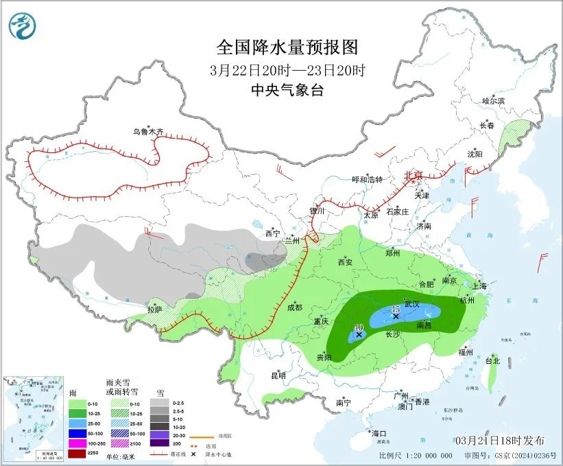 3月21日20时至22日20时,新疆西南部、黑龙江东南部、吉林中东部、西藏东部和南部、青海大部、甘肃河西和西南部、山西北部等地部分地区有小到中雪或雨夹雪,其中,西藏北部、青海南部等地局地有大雪(5~7毫米)。辽宁、西藏东南部、华北中东部、江南大部、西南地区东部和南部、华南北部、台湾岛等地部分地区有小到中雨,其中,西藏东南部、湖南中西部、云南西南部等地部分地区有大雨(25~40毫米)。内蒙古中部、辽宁西部、河北北部和南部、天津等地部分地区有4~5级风;渤海将有5~6级风、阵风7级(见图1)。