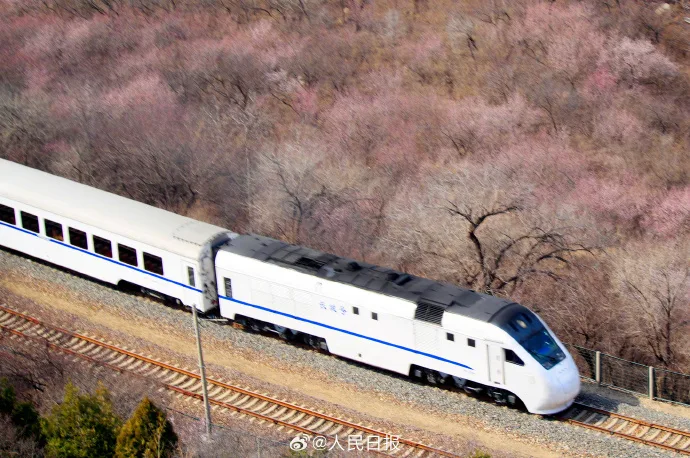 3月21日,一列S2线列车驶过居庸关长城附近,穿过一片花海,一派春意盎然,构成绝美的春日画卷,这也是北京著名的赏花打卡地。