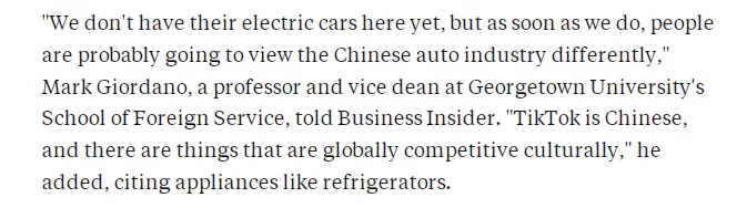 乔治城大学外交学院副院长、教授马克·乔尔达诺在文章中表示:“我们这里还没有他们的电动汽车,中国的电动汽车一旦进入美国市场,人们对中国汽车产业的看法很可能会改变。”